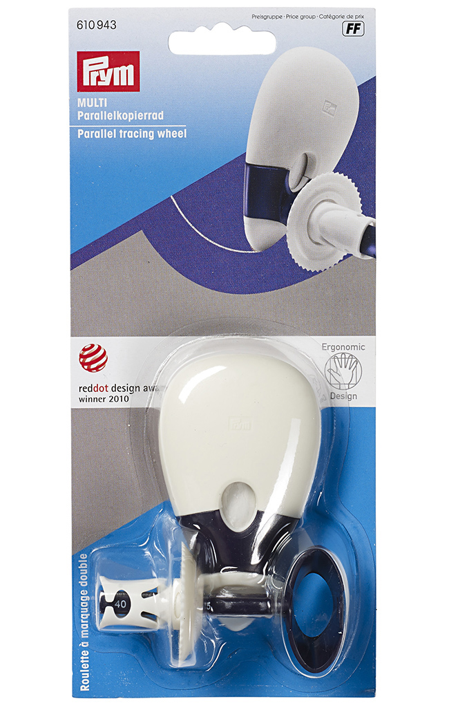 Двойное копировальное колесико позволяет копировать и одновременно проводить линии шва и контуров за счет сменного мелового патрона (Prym 610956 и Prym 610957) и специального устройства, на котором есть возможность выставить разный уровень отступа от края: 1,5см, 2,5см, 4см. Таким образом Вы сможете точно повторить форму нужной вам линии. Очень удобно для разметки припусков при переносе выкройки на ткань. Перед началом работы попробуйте действие мелка на ткани.